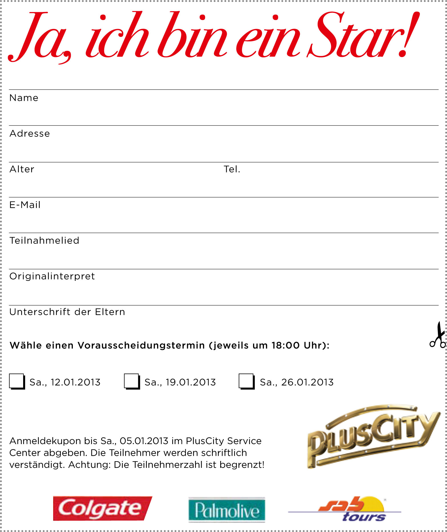 Füll den Anmeldekupon unten vollständig aus und bring die Anmeldung bis Sa., 05.01.2013 zum PlusCity Service Center.
